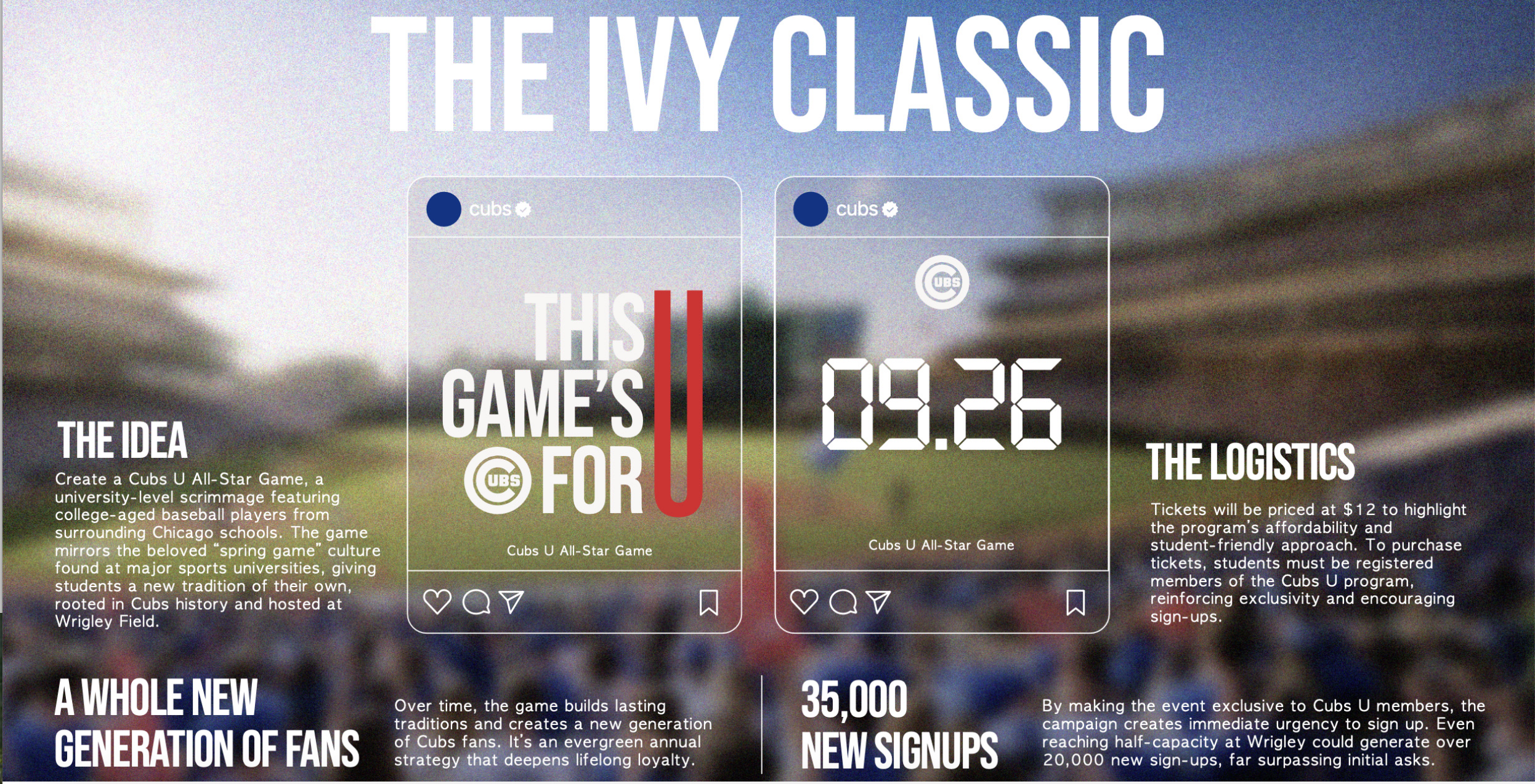 And finally, we created the Cubs U All Star Game, where college players from Chicago area schools compete in a spring game at Wrigley. It mirrors the energy of campus scrimmages but roots it in the heart of the Cubs brand, giving Cubs U a lasting tradition of its own.